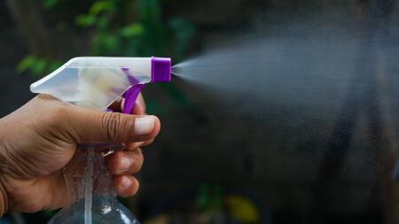water sprayer bottle in a hand in a protective glove spraying liquid on a dark background. household items for home
