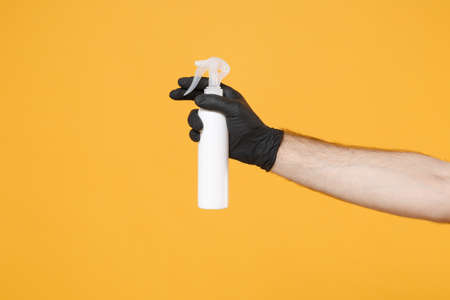 Close up of person's hand with cleaning sprayer isolated on yellow background. Space for text.