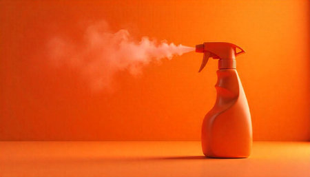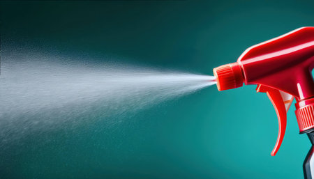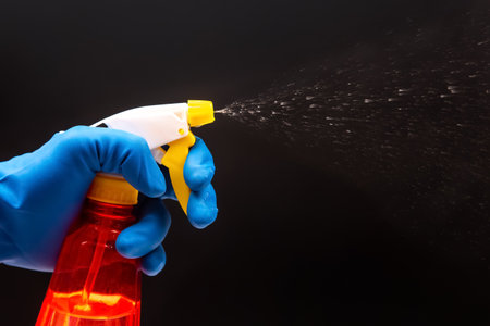A gloved hand activates a red spray bottle with a yellow nozzle, releasing a fine mist on a black backdrop, perfect for cleaning product ads or sanitation themes.
