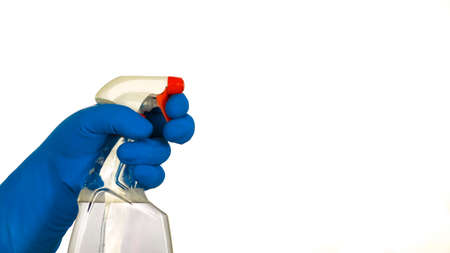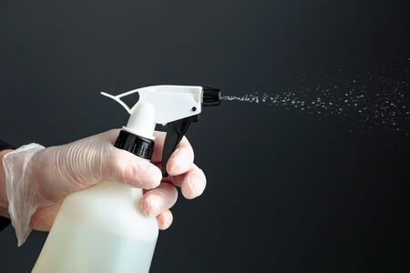 Human hand in glove spraying antibacterial or cleaning solution from sprayer bottle