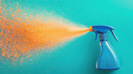 A blue spray bottle filled with detergent, highlighted against a bright turquoise background with an orange splash effect.