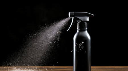 This image features a hand holding a black spray bottle, which is being activated to spray its contents. The background is a plain white, providing a stark contrast that highlights the main subject. The image is clear and SEO-friendly, ideal for use in cleaning or hygiene-related contexts.
