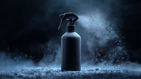 AI Generated. white spray bottle on a dark moody background with atmospheric smoke for product display