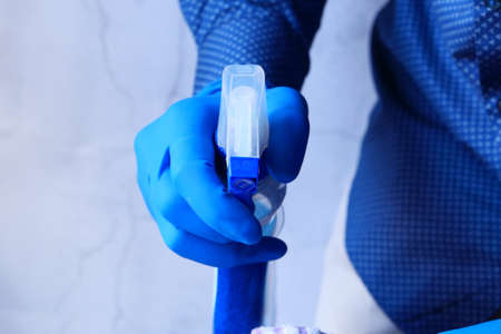 Sterile detergent cleaning spray in hand glove in real life hospital clinic