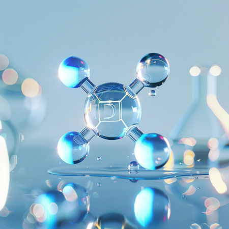 A model of a molecule made from clear blue glass rests on a smooth, reflective surface. The background is blurred, showing out-of-focus blue circles of light.