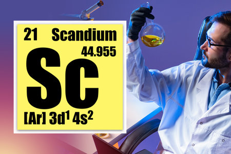 Cell with logo Sc. Scandium element from periodic table. Chemical characteristics of scandium. Concept - study of scandium in the laboratory. Lab assistant with a test tube in background.
