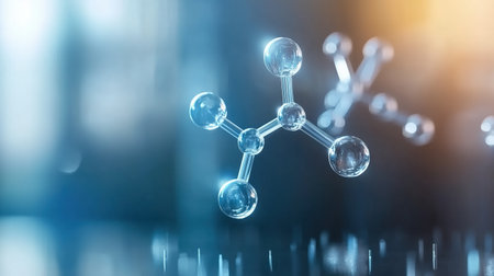 3D molecular structure with glowing transparent elements in a futuristic setting. Concept of nanotechnology, chemistry, and biochemistry