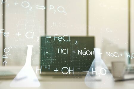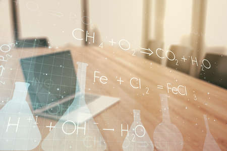 Creative chemistry concept and modern desktop with computer on background. Multiexposure