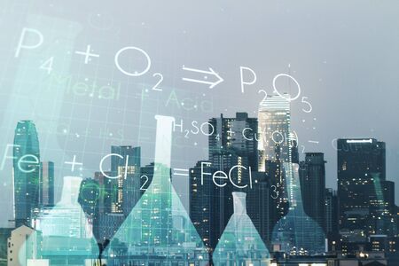 Abstract virtual creative chemistry hologram on office buildings background. Multiexposure