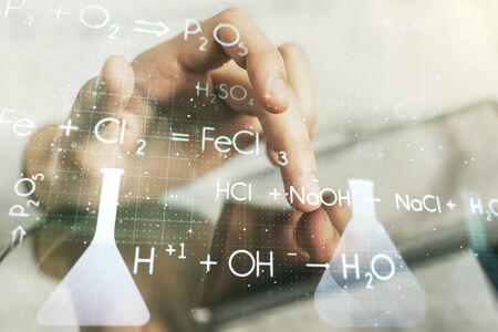 Creative chemistry concept with finger clicks on a digital tablet on background. Multiexposure