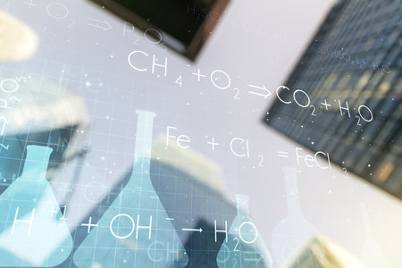 Creative chemistry hologram on contemporary business center exterior background, pharmaceutical research concept. Multiexposure