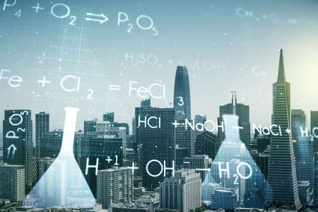 Abstract virtual chemistry illustration on San Francisco cityscape background, science and research concept. Multiexposure