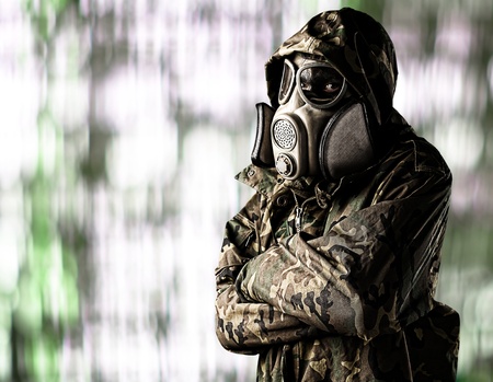 a man in a military uniform and a gas mask holds with an angry expression of emotions on a black background