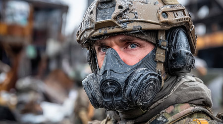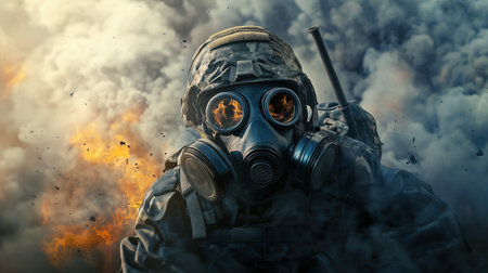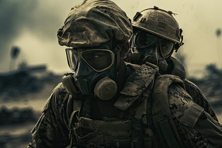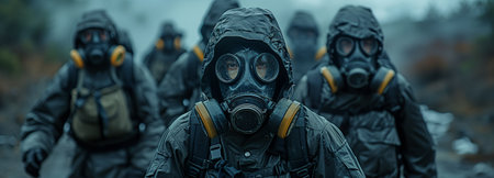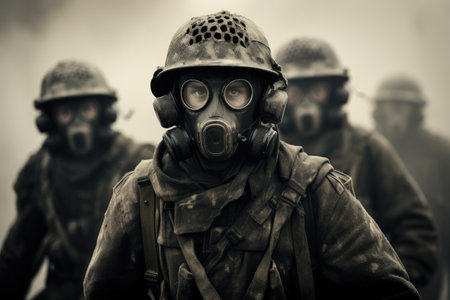 A group of soldiers wearing gas masks. Suitable for military, warfare, protection, and safety concepts.
