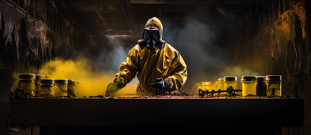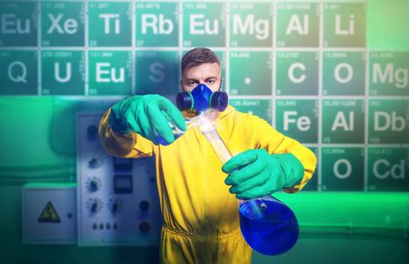 Man in yellow protective suit and respirator working in chemical laboratory.