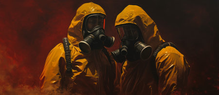 Portrait of two industrial workers in protective suits and gas masks working in a factory. Generative AI