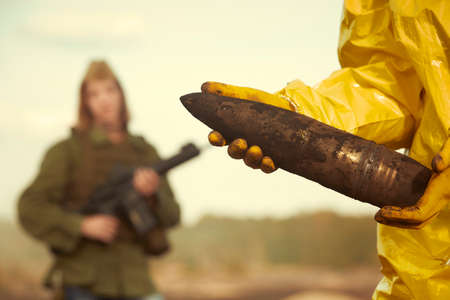 Specialist in chemical protective suit localizing and pick up artillery grenade on field