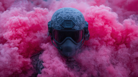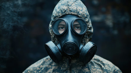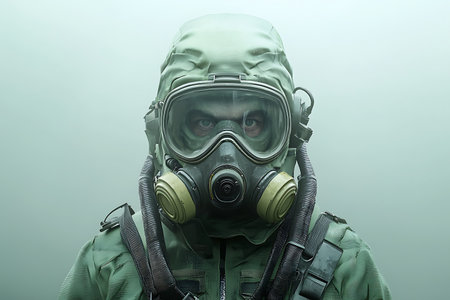 A serious individual wearing protective gear and a gas mask stands confidently in a foggy setting. The image captures the essence of safety and vigilance against environmental threats.