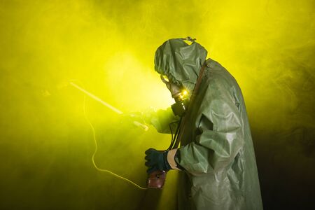 Man in the gas mask and chemical suit. The worker doing measure radioactivity