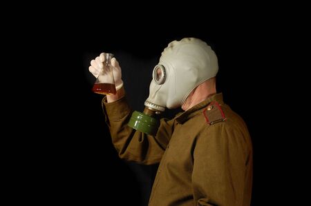 Holding a test tube and examining radioactive liquid. Man dressed in chemical protection suit in the ruins of the post apocalyptic building.