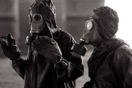 Two people with gas masks and chemical protection suits on the background of the scorched dead earth.
