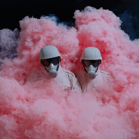 A group of workers in orange protective suits and gas masks, surrounded by colorful smoke, representing safety and preparation.