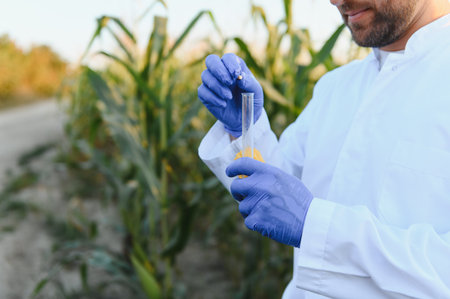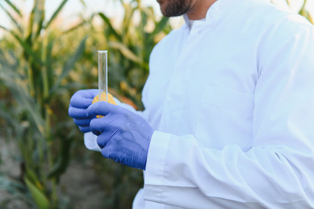 Agronomist is conducting soil testing in a cornfield, using a test tube and gloves, emphasizing sustainable agriculture practices