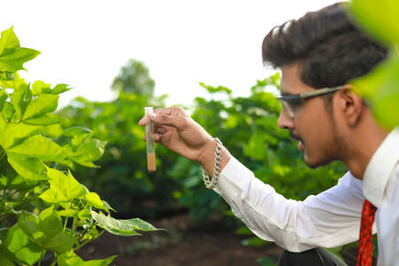 Young indian agronomist with test tube, Agriculture and scientist concept.