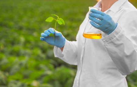 Hand with a test tube and a plant. Fertilizer in laboratory glassware. Concept of crop production.