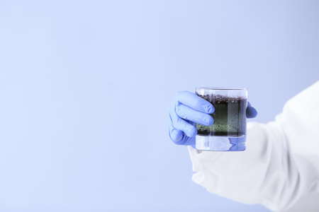 Female doctor with glass of dirty water on color background, closeup