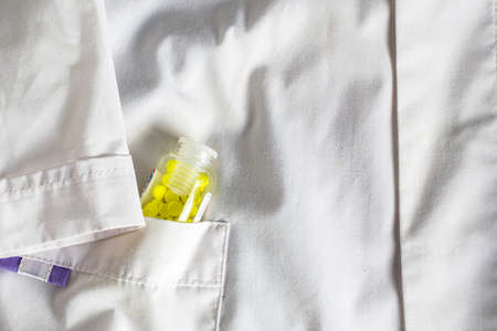 a glass bottle with yellow pills in the side pocket of a white medical coat. High quality photo