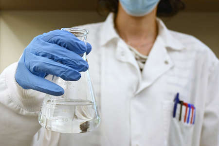 Chemist with the flask in his hands. The girl conducts chemical experiments. The laboratory assistant checks the quality of products. Chemical reaction.