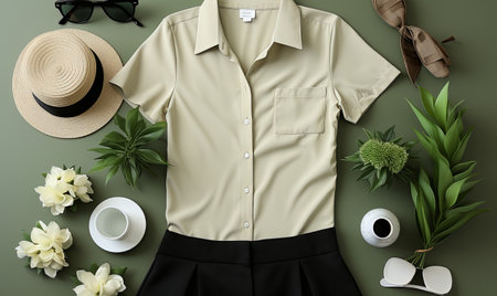 A womans outfit laid out on green grass includes a shirt, skirt, hat, and sunglasses for a day out.