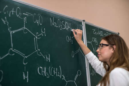 female hand draws chemical equations on a blackboard. lesson in school