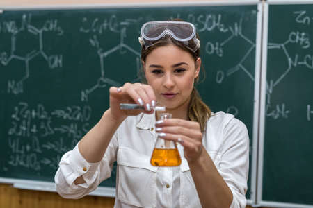 Chemistry teacher holds a flask with orange liquid and conducts a scientific experiment in the classroom. science