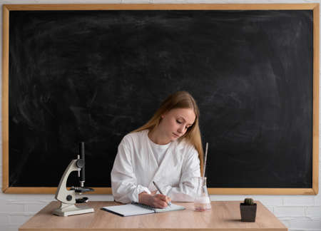A woman teacher in a white coat is sitting against the background of a clean chalk board. The microscope is on the table. The lady is writing in a notebook.