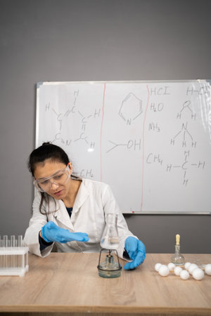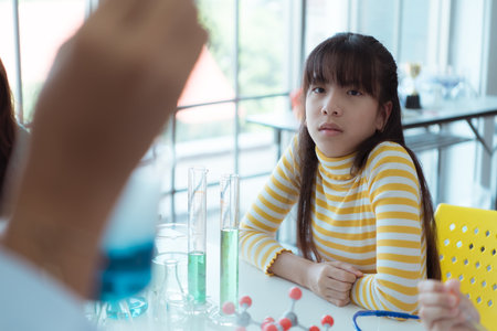 In the science classroom, an Asian child scientist experimenting with scientific formulas with chemicals