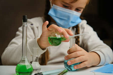 A child playing doctor with glass flask and color liquids. Education and school experiments