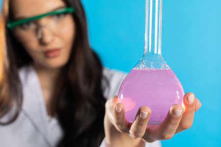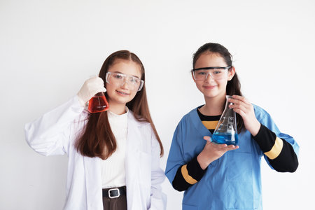 Photo of young adorable girl in safety glasses and gloves holding a flasks for chemistry while doing a scientist experiment at the modern laboratory with isolated white background.