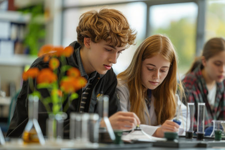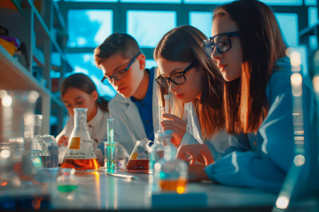 Curious young students concentrating on a science experiment with test tubes and colorful liquids in a school laboratory
