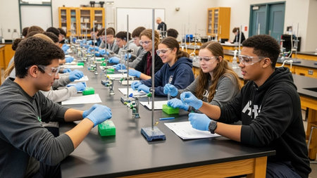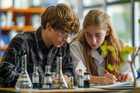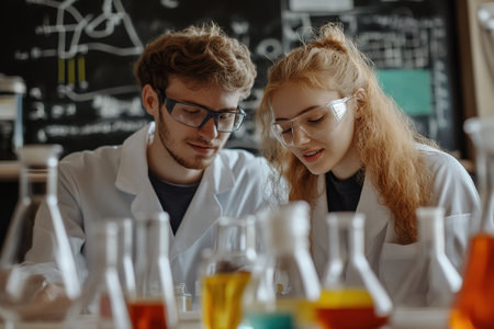 Students conducting experiments in a modern laboratory, wearing lab coats and safety goggles, surrounded by glassware and scientific equipment, focused on collaborative scientific learning