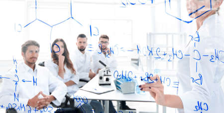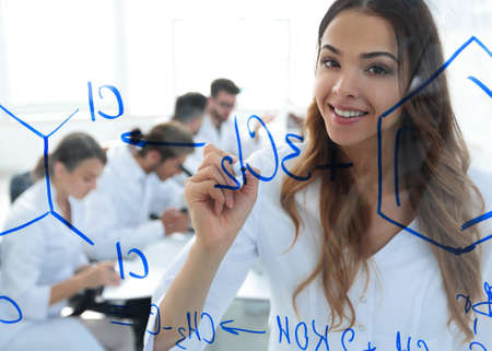 view through the transparent Board. female biochemist makes a report to colleagues