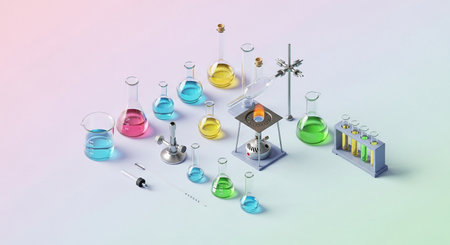 close-up of beakers and test tubes in a science lab, created with generative ai