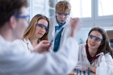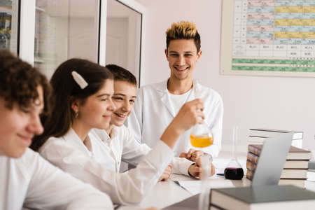 High school students conduct a chemistry experiment. School learning concept, school life, back to school.
