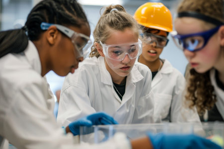 A group of girls wearing lab coats are collaborating on a science project in a lab, Highlighting the potential for positive change through STEM innovation and discovery