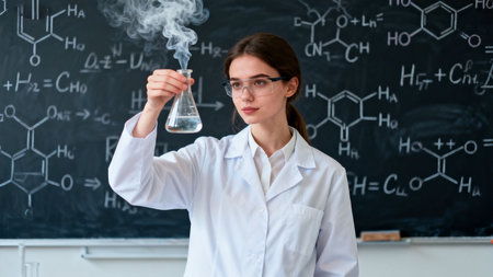 Woman teacher looks at the chemical reaction of a reagent in a flask. Scientific experiments in a school chemistry class