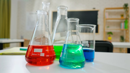 Empty school chemistry classroom with desks, chairs and chalkboard, workspace for teaching and studying. Glass bottles with colorful liquids close up.