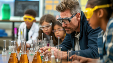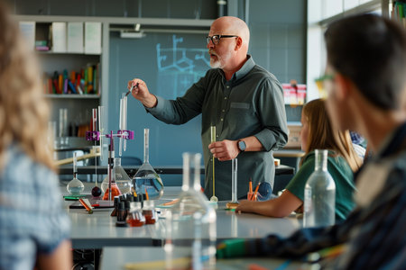 Engaged teacher demonstrating chemistry experiment to attentive students in laboratory setting, showcasing colorful liquids in glass beakers