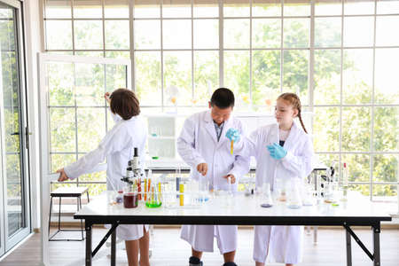 happy kids making science experiments with smiling face. (education and scientist concept)