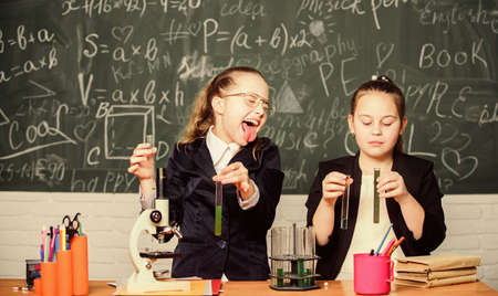 Pupils cute girls use test tubes with liquids. Chemistry experiment concept. Safety measures for providing safe chemical reaction. Basic knowledge of chemistry. Make studying chemistry interesting